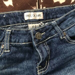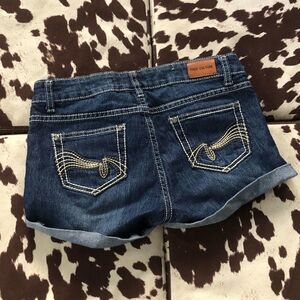 Free Culture Distressed Dark Blue Jean Shorts. Size 7. Great condition. Stretchy. Can be unrolled if desired.