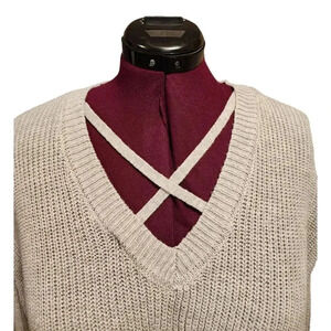 Free For All Oversized Gray Loose Knit V-neck Criss Cross Straps Sweater SZ L