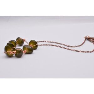 This necklace features 7 Mossy Green organically shaped glass nugget beads, wrapped with copper wire and suspended on a thin copper chain. The copper wire and chain compliment the moss green color of the beads so well. The necklace closes with a rectangle toggle clasp.