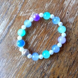 Vibrant beaded bracelet with multicolor beads and a gold accent.