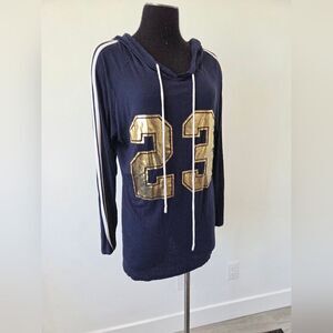 Cute casual hooded top in a dark navy blue color with a gold "23" on front. The hood has a white drawstring and the material is very lightweight. Good condition. Size 1X, measures approximately 30 inches long 22 inches underarm to underarm laid flat.