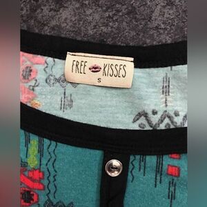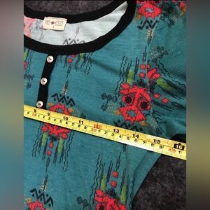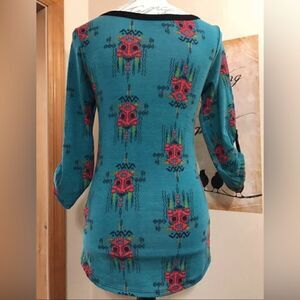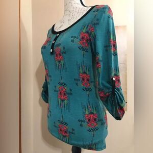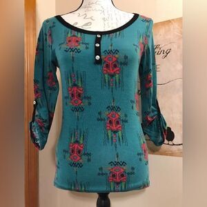 Free Kisses Womens Jrs Stretch Blue 3/4 Rolltab Sleeve Tribal Print Top - Size S