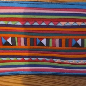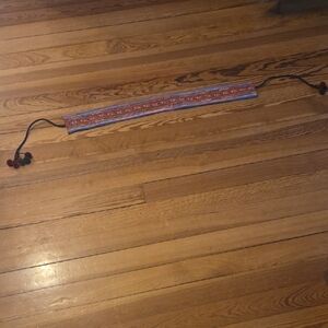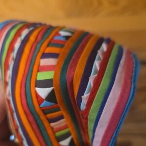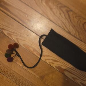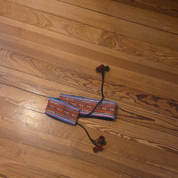 Vibrant striped belt featuring playful pom poms. Perfect for adding a pop of color to any outfit.
