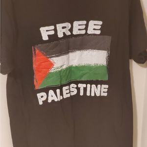 The t-shirt says, "Free Palestine." while also having the flag printed across the t-shirt.