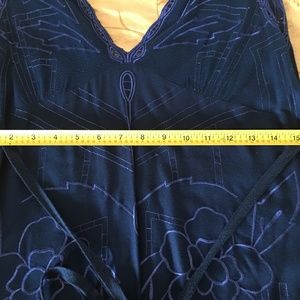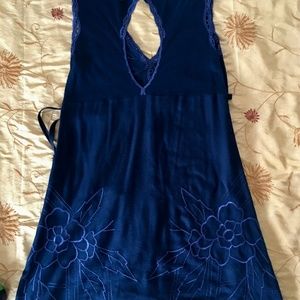 Medium, blue Free People tunic from Anthropologie. Embroidered floral design on front and back. Lovely lacing around hems. Fabric is soft and flowy. Can be worn as a short dress or over leggings. The indigo blue color is rich and so pretty in person. The opening in the back is sexy while still covering your bra!