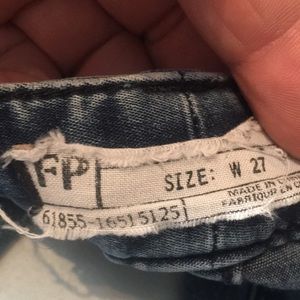 Good looking pair of Free People skinny jeans W-27. Measurements I’m getting is waist 28” x Length 31”. It has a little bit of wear on the buttons, but look good other than that.