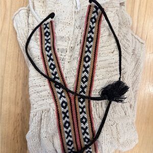 Gauzy crochet tribal inspired open shoulder tunic featuring embroidery detailing. Low V-Neck with drawstring ties and tassel ends. Effortless, oversized fit with bell sleeves and an uneven hem.