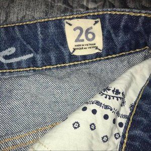 An elevated take on the classic denim mini, this high-rise style features an asymmetric, wrap-front silhouette with distressed detailing throughout for a broken-in look.