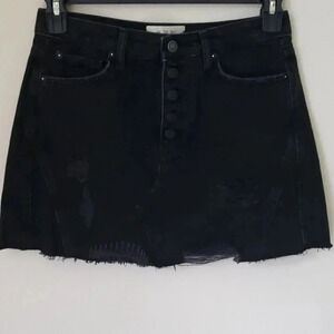 Free People A-line washed black distressed denim skirt. Faded and distressed washed black denim starts at a high waist with belt loops, then carries into a flirty A-line silhouette with seamed detailing and a shredded hem. Button fly adds retro flair. Five pocket cut. Size 28. In excellent condition!
