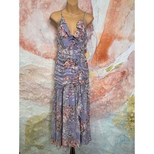 It’s romance in the making. This stunning midi dress features a V neckline that leads to a cinched front with a ruffle accent. Moody floral print throughout features elegant metallic detailing throughout.