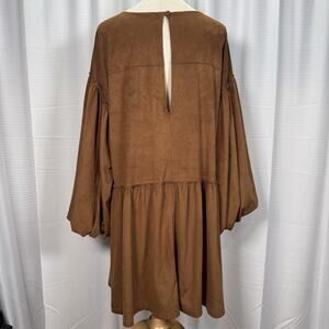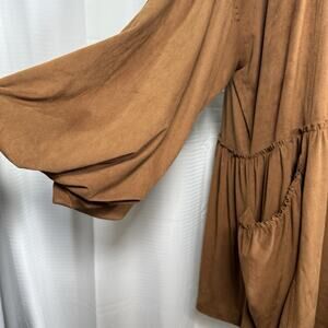 The Free People Abbie Vegan Suede Mini Dress in size Large is a boho chic piece perfect for various occasions such as travel, parties, or casual outings. Made of soft suede fabric, this long-sleeved dress features a round neckline and balloon sleeves for a unique look. With a solid brown color and oversized fit, it embodies a Western, nature-inspired theme that is both stylish and comfortable. The pullover closure and short dress length make it ideal for the winter, fall, and spring seasons, adding a touch of artistry and hippie flair to your wardrobe.