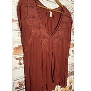 Free People Abigail Flowing Oversized V-Neck Lace-Crochet Detailing Tee in Wine