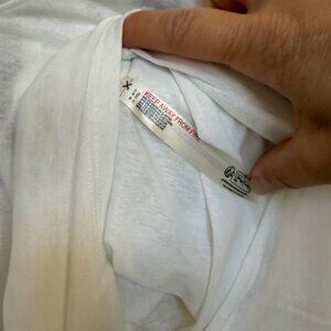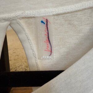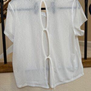 White t-shirt with keyhole back. Shirt dips to a point in center front.