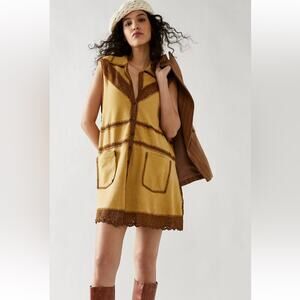 Free People Adeline Goat Suede Crochet Retro Boho Mini Dress Tan/Brown Size M