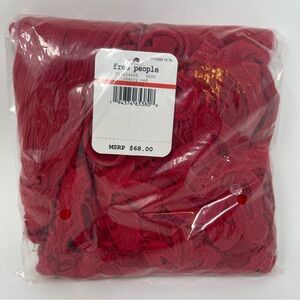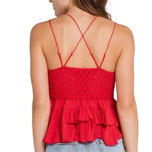 Free People Adella Cami Cherry Red. Lined bust crochet smocked back tank. Tiered ruffle crinkle hem. Adjustable crisscross straps. Brand new with tags. Size XS and S available.