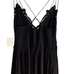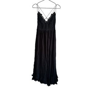 Boho-chic romance is yours in this sweeping slipdress styled with a lacy plunge-neck bodice and a flowy ruffle-trimmed skirt.
