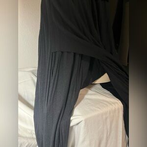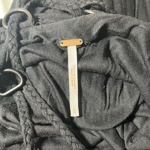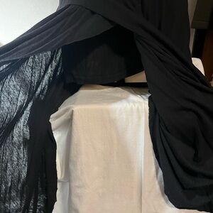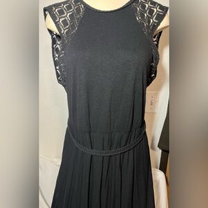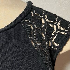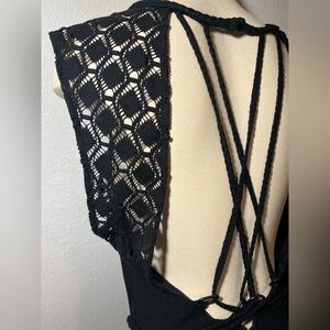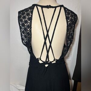 This elegant black sleeveless dress features a stylish open back design, with intricate crochet detailing. The raw, asymmetrical hem features a mini lining and side split, creating a sexy and dramatic effect. This dress has so many cool details and is sure to turn heads. The dress offers a modern look, ideal for evening events or casual outings.