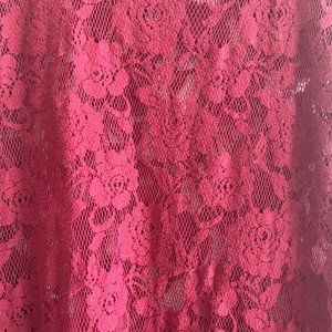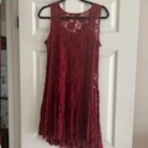Free People Aline Lace Top in red. No size tag but it is about 19 inches pit to pit and does have a little stretch and about 32 inches long in front and 34 inches long in back.