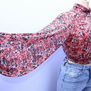 Free People All Dolled Up Red Floral Print Mesh Long Sleeve Crop Top, Size XS