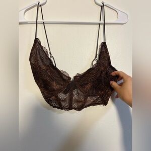 Features: Underwire-lined cups, lace fabrication with metallic detailing, thin adjustable shoulder straps, low back with hook-and-eye closures, supportive boning
