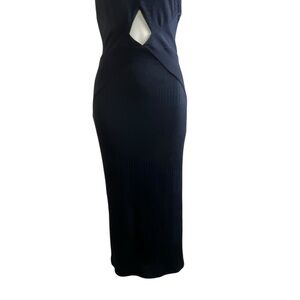 Free People All The Right Angle Bodycon Black Dress sleeveless with keyhole design on chest, bandage construction, ribbing,midi length, strappy racer back with metal O ring design on back, V-neck, lined, stretchy material. it a must-have in your wardrobe.