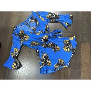 Free People Women’s Royal Blue Floral All the Right Ruffles Romper Size Small. One piece step in with button back, ruffle edging, faux tie waist and short short bottoms. In good condition. - elastic waist - back keyhole button closures Underarm to underarm- 17 inches Waist- 14 stretches to 16 inches Length, collar to end- 28 inches Summer Romper Floral Beach Concerts Hot Sexy Body body