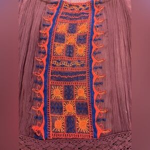 Free People's sheer chiffon blouse featuring colorful embroidery detailing and pieced with intricate embroidery trim. A beautiful sexy and flirty vibrant purple and orange top. Perfect for adding a touch of noho fun to any outfit. 100% locally, 100% polyester. Made in India. Hand washable