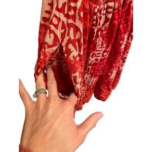 Free People Alluring Beach Day Mini Dress with a Keyhole Halter Neckline Red & Orange print. Size Small. High low hemline on the dress. Dress is shorter in the front than the back. Has pockets in both sides of the dress!