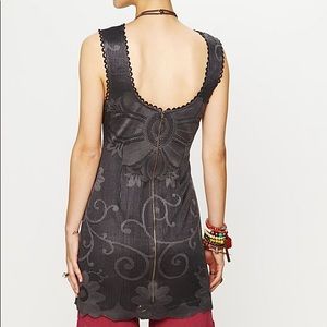 FP New Romantics Almost Famous gray frock dress. This dress has a slightly retro feel, and has a cute and flattering shift dress or tunic dress fit. The dress has a very cute high neck look with a rounded jewel neckline in the front, and a low U-shaped scoop back. The bottom is scalloped-cut with the floral pattern. There are a few very small thread pulls, as seen in photos. Size 2