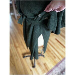 Features: Army green knit; side slits; wrap belt; interior wrap ties; button feature on one side; fairy tale hood.