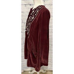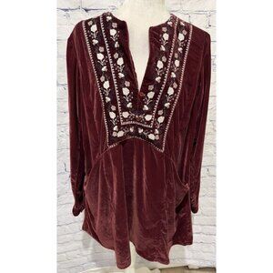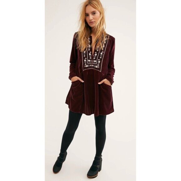 Luxe velvet mini dress featuring boho-inspired floral embroidery along the neckline.