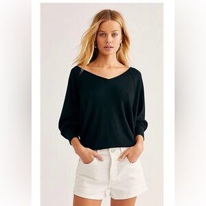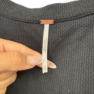 Free People Amara embroidered sleeve thermal top in classic black. Excellent condition. This cult-favorite long sleeve features a flattering V-neckline, slightly cropped relaxed fit, and soft waffle-knit thermal body. Statement floral embroidered sleeves with contrast stitching add a boho, elevated edge. Perfect for layering or wearing solo with denim, cargos, or skirts for effortless everyday style.