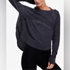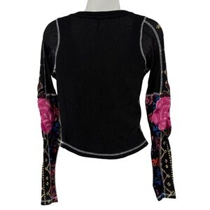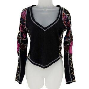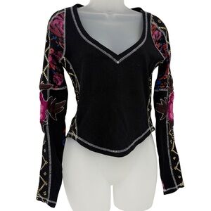 Free People Amara Embroidered Sleeve Thermal V Neck Top Black Pink Floral XS
