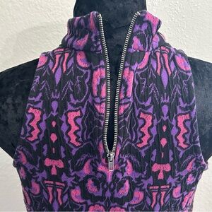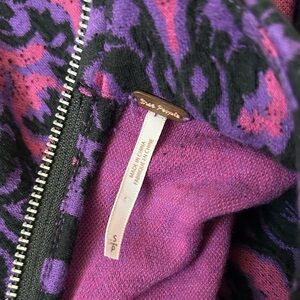 Beautiful Free People Amelia Knit Dress in a bold purple, pink, and black jacquard pattern.