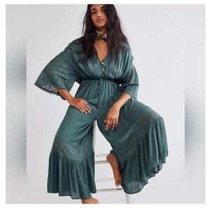 Free People Angela Jumpsuit Sz Small Wide Leg Green Boho Lace Ruffle Festival.