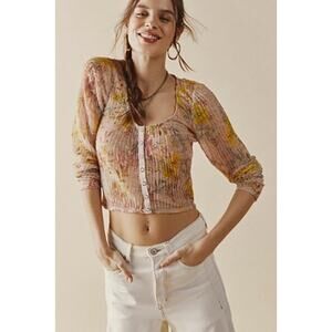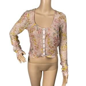 Free People Angelina Light Combo Pink Floral Sheer Lace Snap Top SZ M
