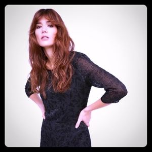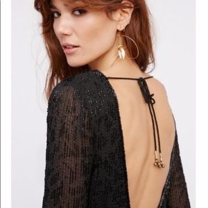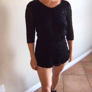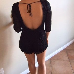 NEVER WORN WITH TAGS (realized it is too short on me). Allover beautifully beaded romper with a low open back. Sheer sleeves and a scalloped hem. Hidden side zip. Lined. Style No. 41115973