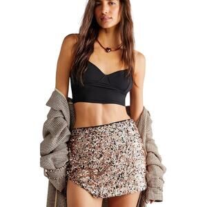Free People Annalise Sequin Mini Skirt. Sequin embellished mini skirt with a slit hem feature. Slim, high-rise silhouette. Hidden zip closure. Lined. Size: 6 Waist: 15.5" Hips: 18.5" Length: 13" Condition: NWT. New.