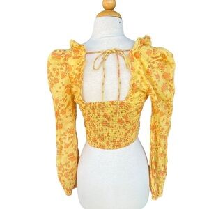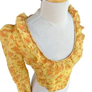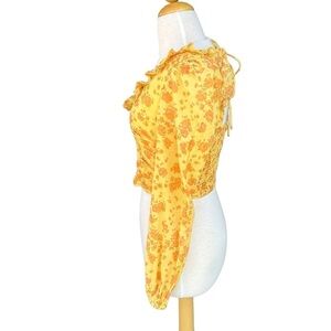 Free People Another Life Floral Printed Crop Top. Women’s size small. Color is Honey Combo. Puff shoulders with billowy sleeves, elasticized cuffs. Smocked back with a sting tie at the shoulders. Ruching at the sides and ruffle detail at neckline. Feminine boho style! Good preowned condition! The metal FP logo is detached on one side.