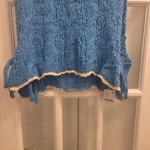Free People stylish sleeveless open sides crochet sweater with textured design. Bright blue color. Perfect for casual outings or a swim cover up. NWT!! NEVER WORN!!