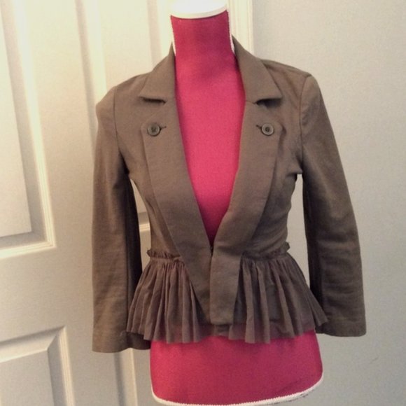 Like New and simply adorable - Army green Free People ruffled peplum jacket. Hidden hook and eye closure with a tulle or chiffon-like ruffle around hem. Three buttons on sleeves. Dress up or down. Super light and SOO soft! This is a great little jacket to pair with a cami and some jeans with heels or boots for a perfect date night outfit, (even in the Summer.) It's that light and works great for those chilly movie theaters and restaurants. Simply flirty and BEAUTIFUL!!