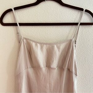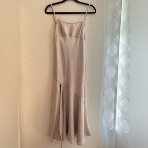 Sultry and classic slip dress featured in a square-neck silhouette with seamed bust detailing, bias-cut silhouette, and asymmetrical hemline trim for added shape.