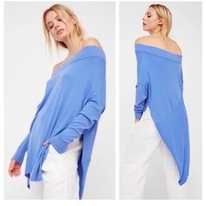 Cute, oversized, slouchy, and asymmetrical periwinkle tunic top from We the Free (Free People). Size XS and in good preowned condition; no visible flaws.