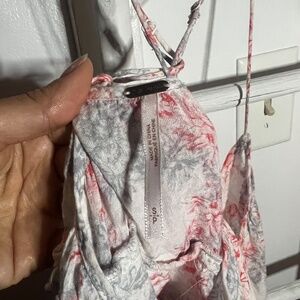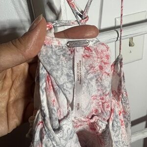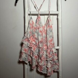 Asymmetrical Floral Top with Ruffles. Adjustable Straps. White, Pink, and Gray.