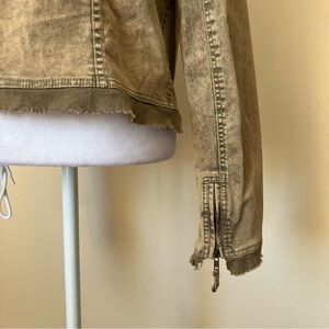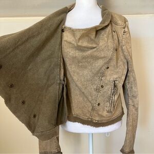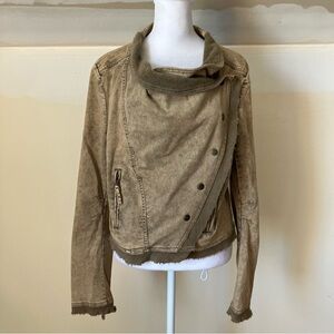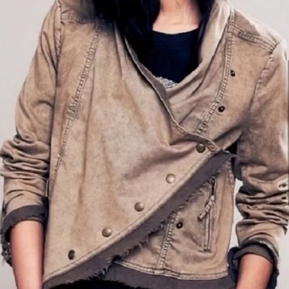 Very cool, Free People, tan jean jacket. Moto style. Asymmetrical design with button details. Front zipper and sleeve zippers. Perfect for layering. 20” chest and 19” length