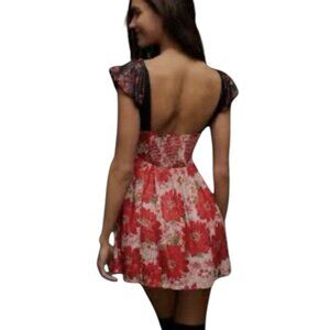 Free People Aurora Dress Red Floral A-line Mini Babydoll Puff Sleeves Large NWOT