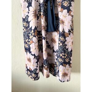 Features: Soft satin fabrication with floral print all over, contrast lace detail at bust, center-front tie, cap-inspired flutter sleeves, smocked elasticated back