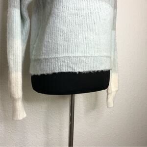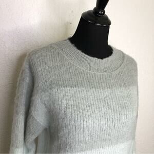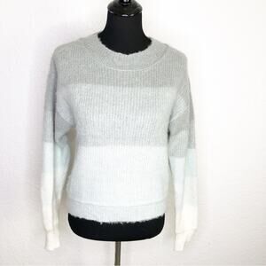Free People Autumn Sky Cloud Combo gray and blue striped wool blend sweater. Pullover style with crew neckline. Drop shoulder sleeves. Ribbed hemline and sleeve cuffs. Size Small. Very good preowned condition. Some fuzzing from wool.