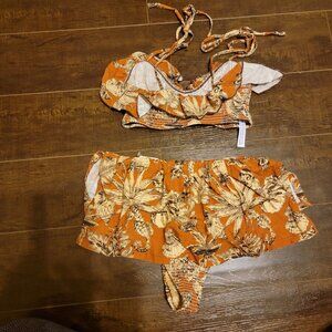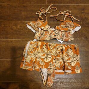 Elevate your swimwear collection with this boho-chic bikini set. Featuring a ruffled top and skirted bottom in a vibrant floral design, it ensures effortless style.