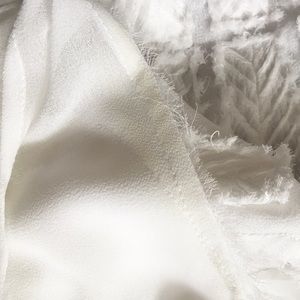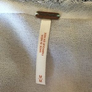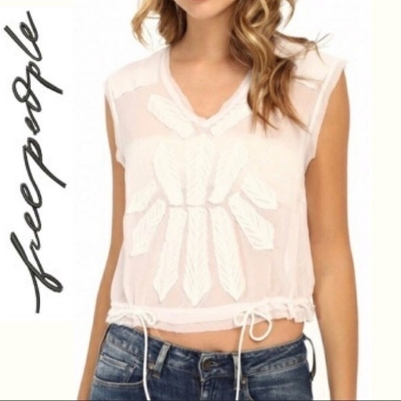 Beautiful sheer white free people blouse. Raw edges, can be tied at bottom for a blouson effect. Excellent general condition, but there is a slight yellowing of right shoulder at seam, mostly inside, a VERY slight yellowing in same spot on other side, and mildly damaged front embroidery. None very noticeable while wearing. See photos. Overall great used condition. Smoke free home.